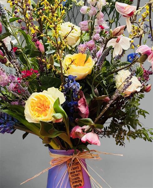• Delivered in a recycled vase made in the uk from household waste and rubbish found in the sea. Shatterproof , reusable and returnable Return and refill !