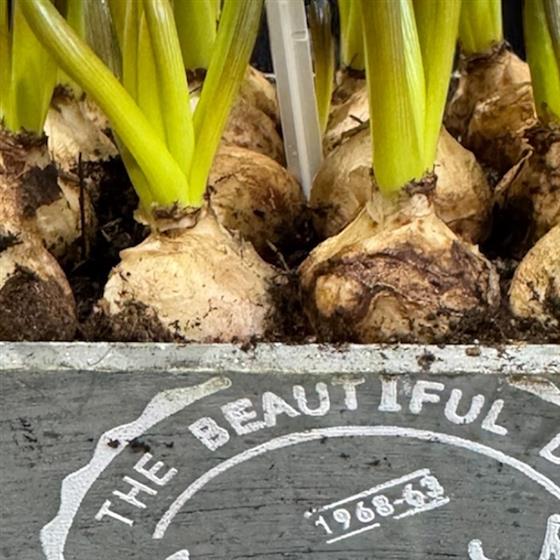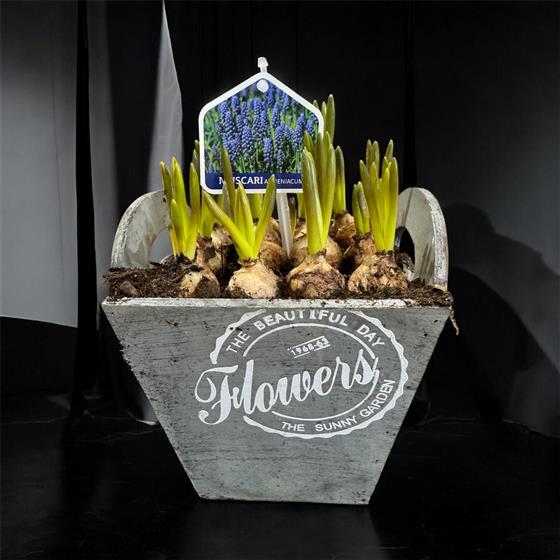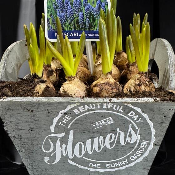 Gorgeous blue muscari bulbs in wooden display
