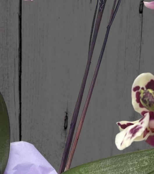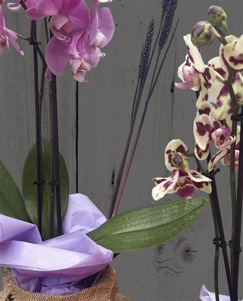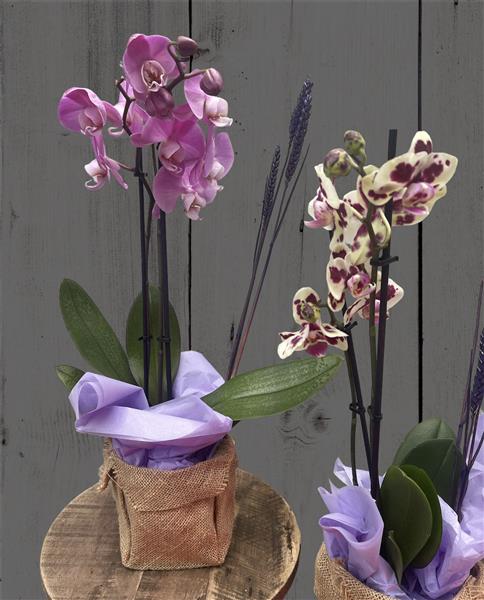A pretty phalenopsis orchid plant delicately wrapped in tissue/ paper and a hessian wrap